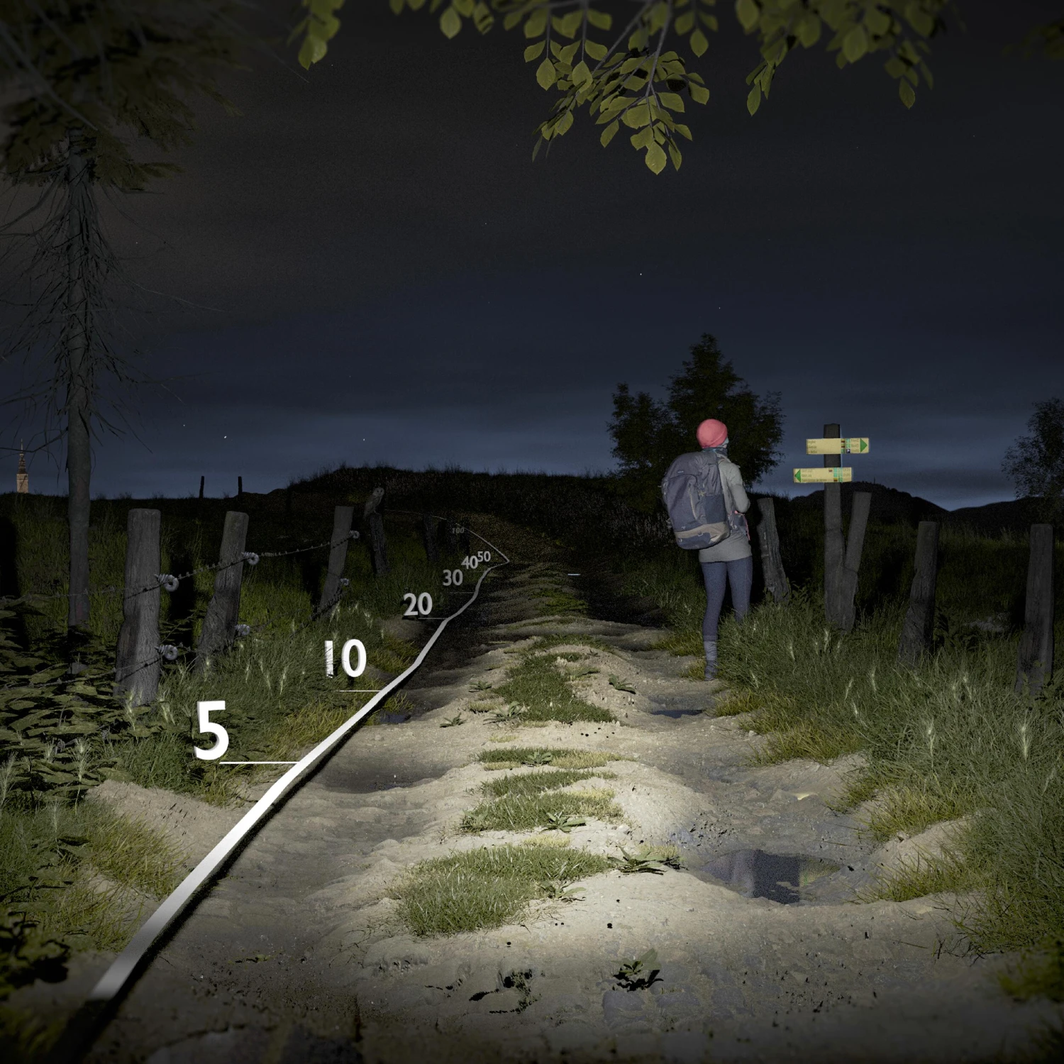 A very wide red beam to remain discreet and see at very short distance (hut).A wide beam, with warm light, so you can see in front of you and to the sides, close up and in the middle distance.