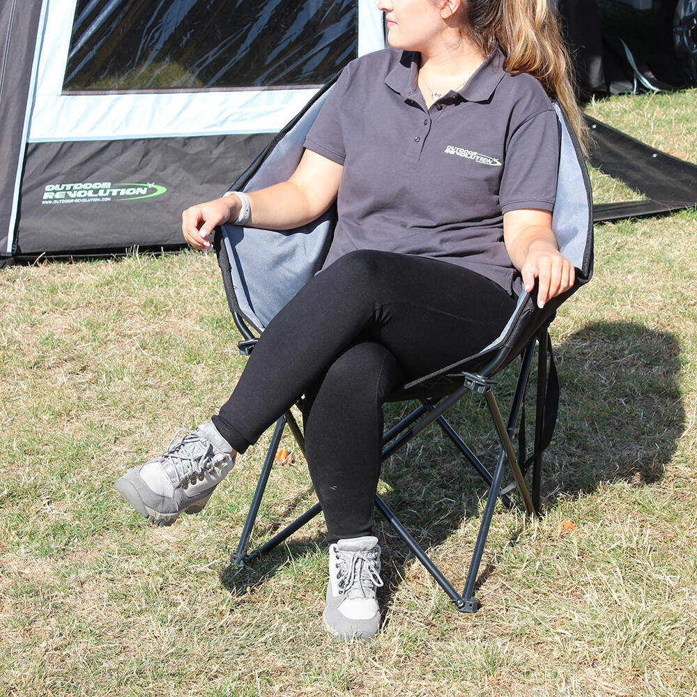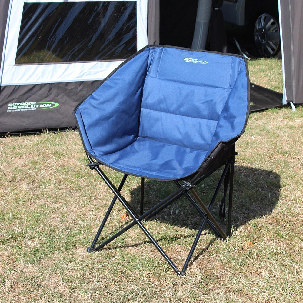 A compact folding camp chair with comfortable padded surround sides and supportive backrest.ย The padded fabric and sturdy steel frame provide exceptional comfort and support whilst the oversize wide base feet help to prevent the chair from sinking into soft ground and damaging ground sheets. Available in a choice of 3 complimenting colour variations. โข Opens and folds in seconds