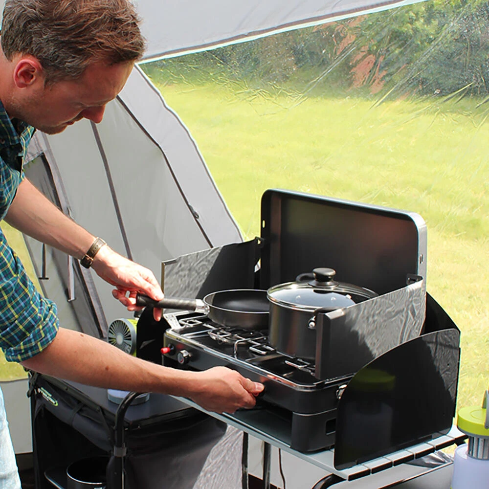 This Twin Burner Gas Stove and Grill offers the perfect blend of high performance with compactness and style. Thanks to the braided hose with control valveย which takes a Butane Propane screw fitting resealable gas canister, there is no need to use a separate hose and regulator with a refillable gas cylinder, which cuts down on space and weight during transportation. This is the only Twin Burner we know of in the market currently that has 2 burners and a grill that takes this type of high-power gas canister. You only pay for the gas you need to use when you are away whether it be for a weekend or an extended trip. Each 450g gas cannister (supplied separately) will run all the burners on full power for around 60 minutes, and the powerful 3kW burner will boil a litre of cold water in 7 minutes. Total Weight 6Kg โข Twin burners: 2 x 3 kW